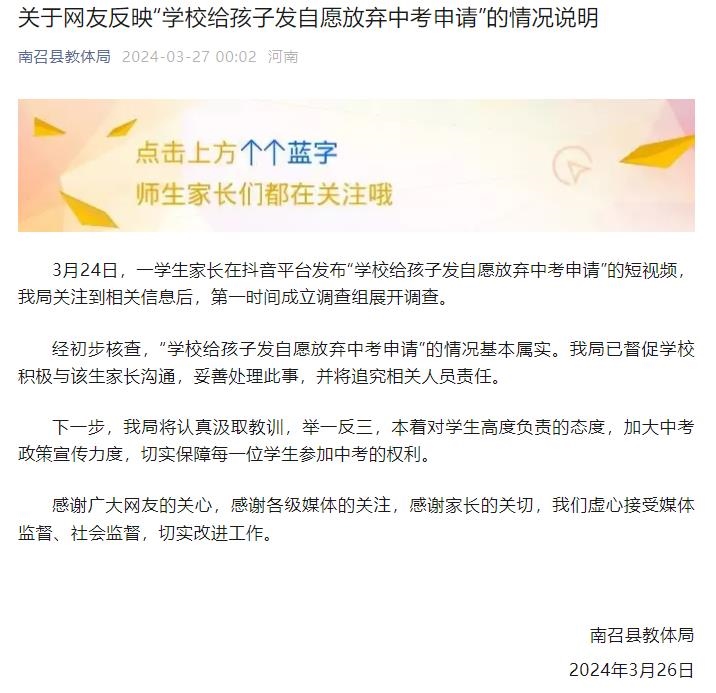 說明稱,3月24日,一學(xué)生家長在抖音平臺發(fā)布“學(xué)校給孩子發(fā)自愿放棄中考申請”的短視頻,該局關(guān)注到相關(guān)信息后,第一時間成立調(diào)查組展開調(diào)查。