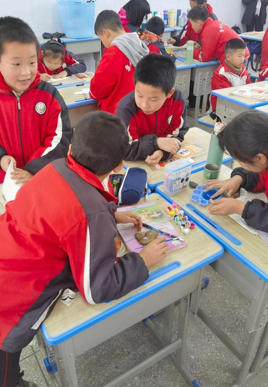 美術(shù)課上,李柏霖讓孩子們在石頭上作畫