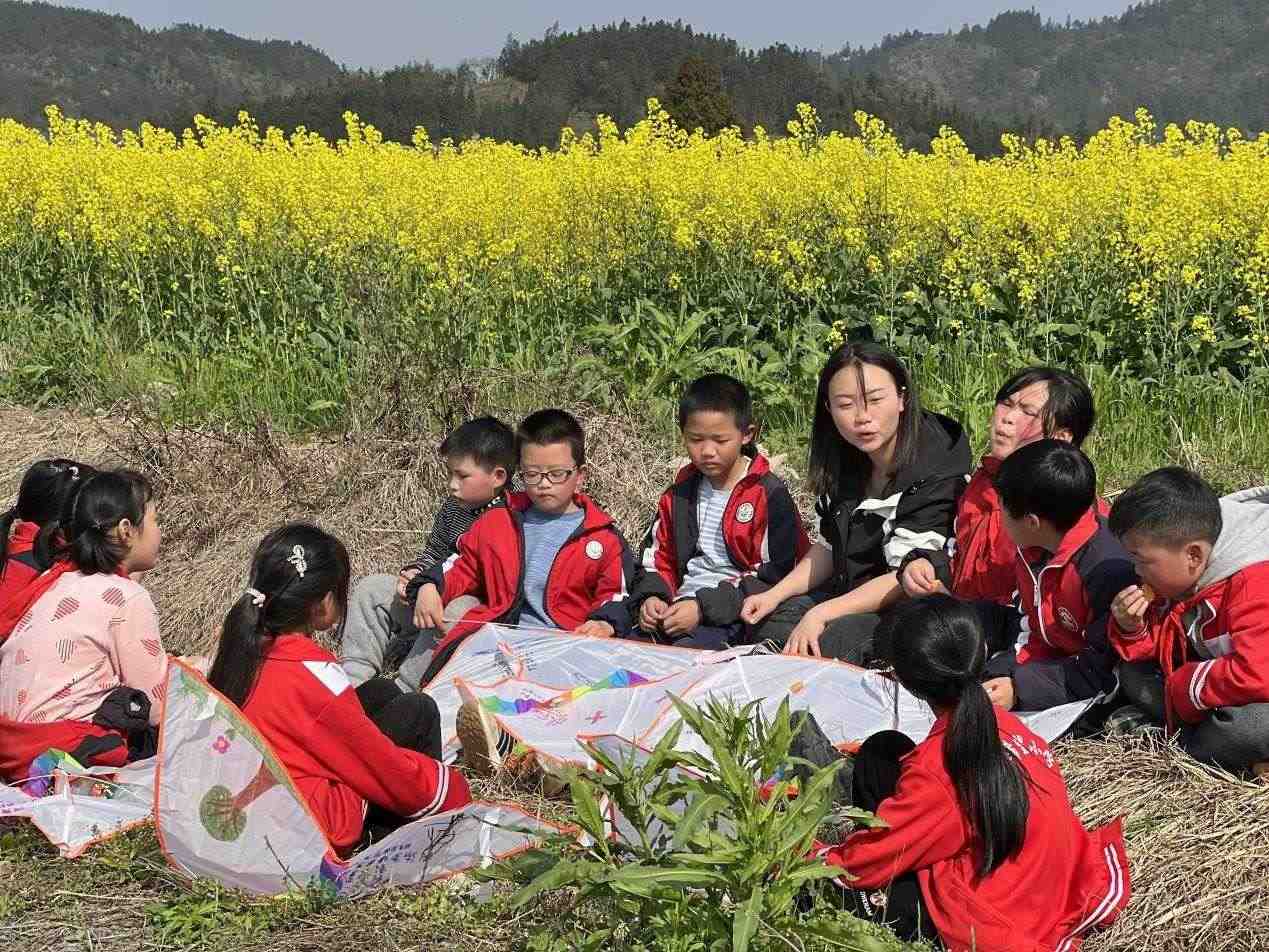 李柏霖不愿意讓孩子們覺得這樣的情緒是生活的全部。她把課堂搬到野外,在“搖搖花”開的時(shí)候帶孩子們?nèi)タ础皳u搖花”,油菜花開時(shí)去看油菜花。花也是詩,家鄉(xiāng)也是詩——若非如此,老師為什么走了又回呢?