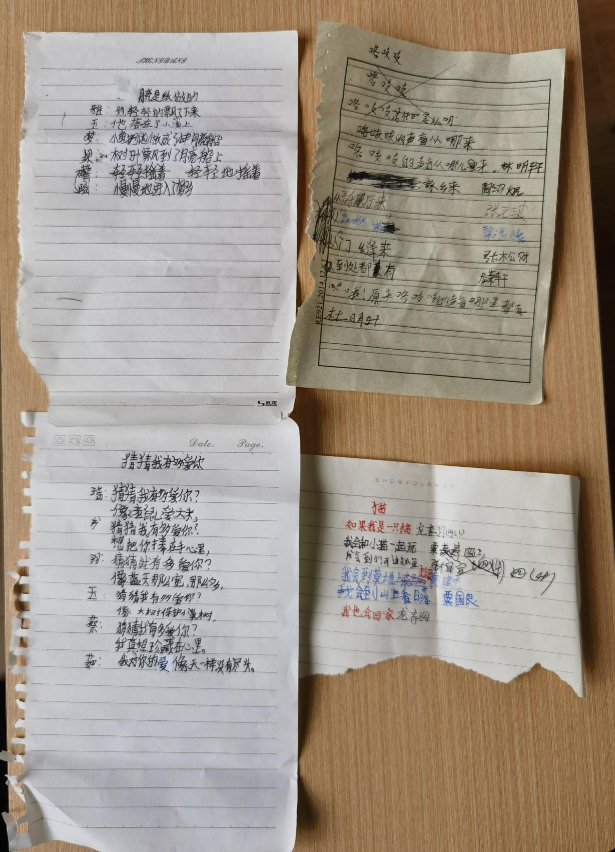11歲的龍夢瑤是詩班里高產(chǎn)的一個(gè)。她在本子上擠擠挨挨寫一團(tuán)字,一把撕下整頁,塞給李柏霖。這樣的紙片,李柏霖一天要收到幾十張。大大小小夾在書里,她晚上批改完,第二天再拿回學(xué)校,在課堂上分享。她估計(jì),孩子們寫的詩已經(jīng)超過2000首。