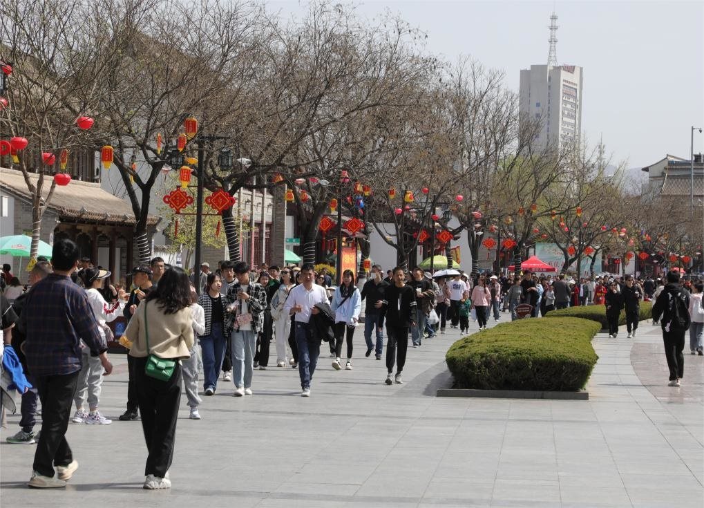 4月4日,游客在甘肅省天水市伏羲城步行街游覽參觀。新華社記者 張智敏 攝