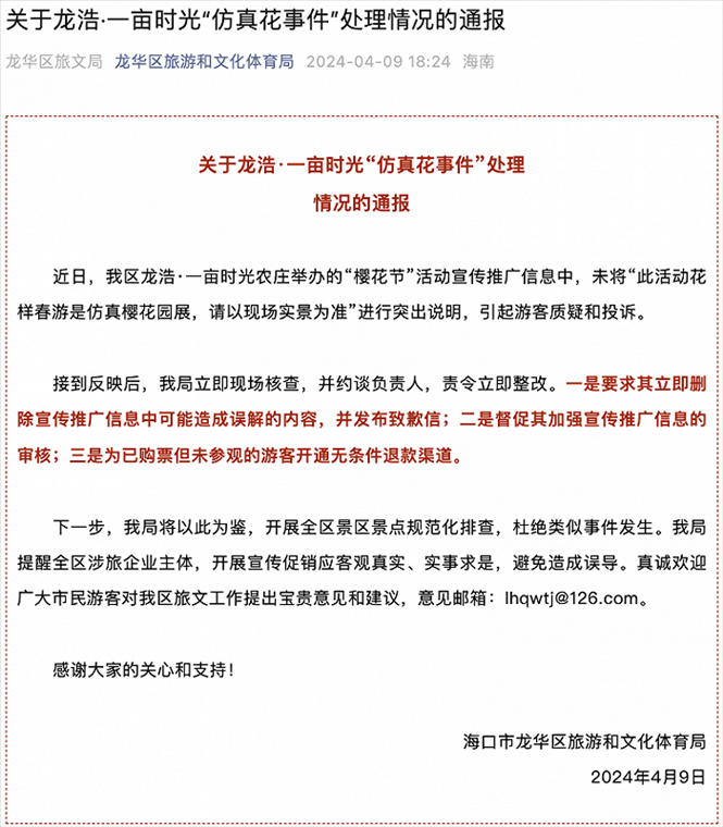 ·??谝晦r(nóng)莊辦“櫻花節(jié)”樹上全是假花?官方通報(bào):約談責(zé)任人,責(zé)令立即整改。