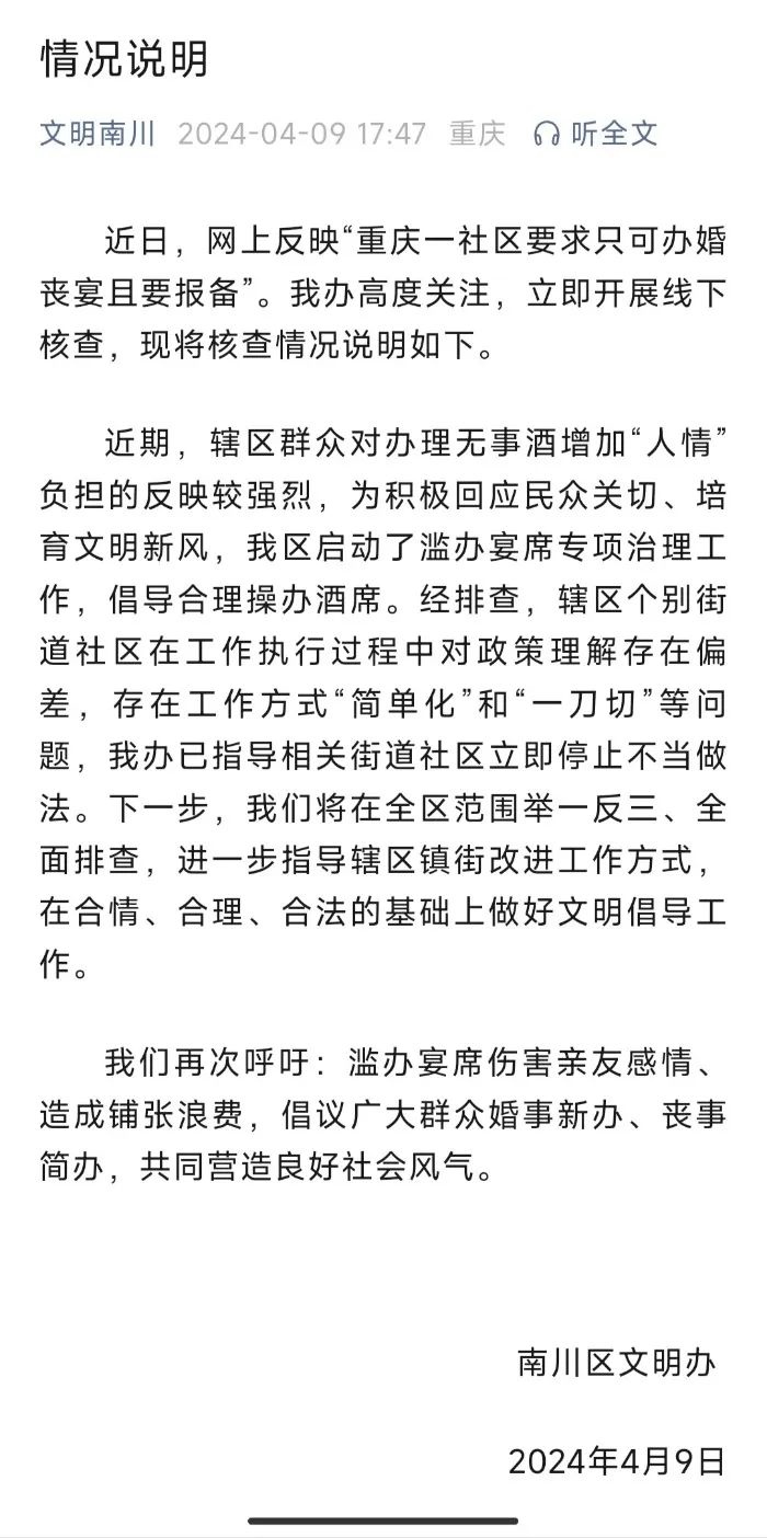 ·除了婚喪宴其他酒席都不準(zhǔn)辦?重慶南川區(qū):不當(dāng)做法,立即停止。