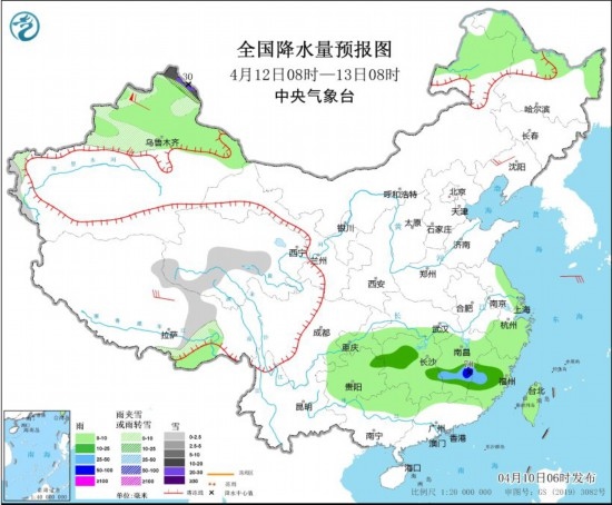 4月12日08時(shí)至13日08時(shí),新疆北疆北部和沿天山地區(qū)、西藏東部、青海南部等地部分地區(qū)有小到中雪或雨夾雪,其中,新疆北疆北部的部分地區(qū)有大到暴雪,局地大暴雪(20~30毫米)。貴州西北部、湖南中部、江西中部、福建中部等地部分地區(qū)有中到大雨,其中,江西東部的部分地區(qū)有暴雨(50~70毫米)。新疆南疆盆地、西藏北部、遼寧西部等地部分地區(qū)有4~6級(jí)風(fēng),其中,新疆北疆北部部分地區(qū)有8~9級(jí)風(fēng);渤海、渤海海峽、黃海大部海域部分海域?qū)⒂?~7級(jí)。