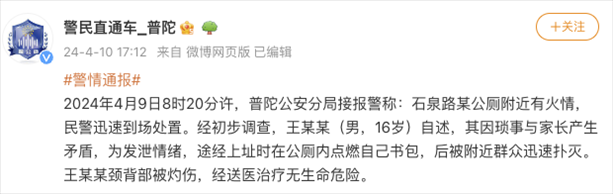 央視網(wǎng)消息:據(jù)@警民直通車(chē)_普陀 微博消息,4月9日8時(shí)20分許,上海普陀公安分局接報(bào)警稱(chēng):石泉路某公廁附近有火情,民警迅速到場(chǎng)處置。經(jīng)初步調(diào)查,王某某(男,16歲)自述,其因瑣事與家長(zhǎng)產(chǎn)生矛盾,為發(fā)泄情緒,途經(jīng)上址時(shí)在公廁內(nèi)點(diǎn)燃自己書(shū)包,后被附近群眾迅速撲滅。王某某頸背部被灼傷,經(jīng)送醫(yī)治療無(wú)生命危險(xiǎn)。
