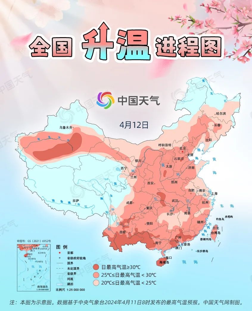 眼下,全國(guó)大部處于冷空氣影響間歇期,升溫是主旋律。預(yù)計(jì)今起三天(4月11日至13日),我國(guó)從北到南都將開(kāi)啟回暖進(jìn)程,最高氣溫25℃以上的區(qū)域幾乎覆蓋整個(gè)中東部,波及20余省份,東北、西北地區(qū)氣溫將大面積創(chuàng)今年以來(lái)新高,北方不少地方還會(huì)體驗(yàn)到常年5月中旬才有的超前暖熱。中國(guó)天氣網(wǎng)推出全國(guó)升溫進(jìn)程圖,看看哪些地方將沖擊30℃。