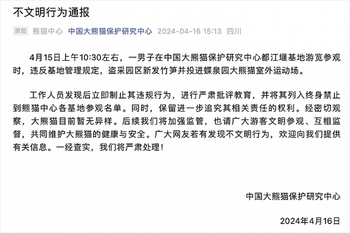央視網(wǎng)消息:4月16日,中國大熊貓保護(hù)研究中心發(fā)布不文明行為通報(bào):4月15日上午10:30左右,一男子在中國大熊貓保護(hù)研究中心都江堰基地游覽參觀時(shí),違反基地管理規(guī)定,盜采園區(qū)新發(fā)竹筍并投進(jìn)蝶泉園大熊貓室外運(yùn)動(dòng)場。