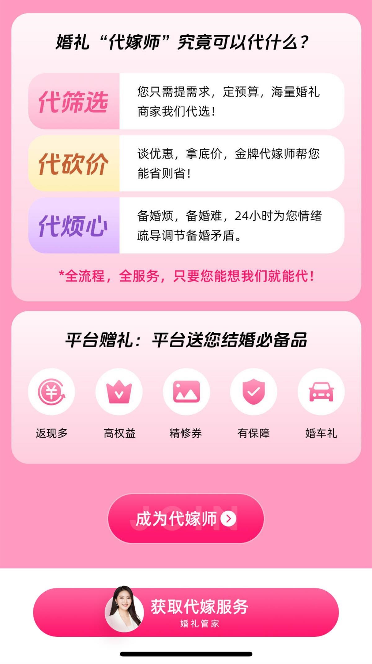 該頁面還宣傳稱,代嫁師可以“代篩選”“代砍價”“代煩心”,并且還有一行字強調(diào):“全流程,全服務(wù),只要您能想,代嫁師就能代。”