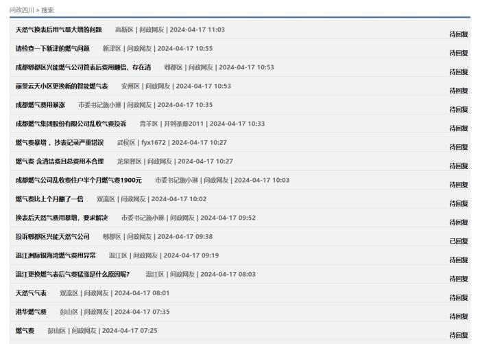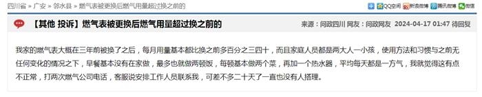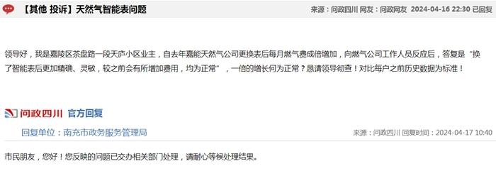 中新網(wǎng)4月17日電(中新財經(jīng)記者 吳濤)近日,在“問政四川”平臺上,不少網(wǎng)友反映“更換新表后燃?xì)赓M異常上漲”,這些留言顯示來自四川成都、自貢、廣安、南充等多地,僅僅在4月16日,保守估計就有十幾條;17日上午又出現(xiàn)十幾條。大部分尚未得到回復(fù),部分獲得官方回復(fù)稱“留言已轉(zhuǎn)交給相關(guān)機(jī)構(gòu)進(jìn)行處理”。