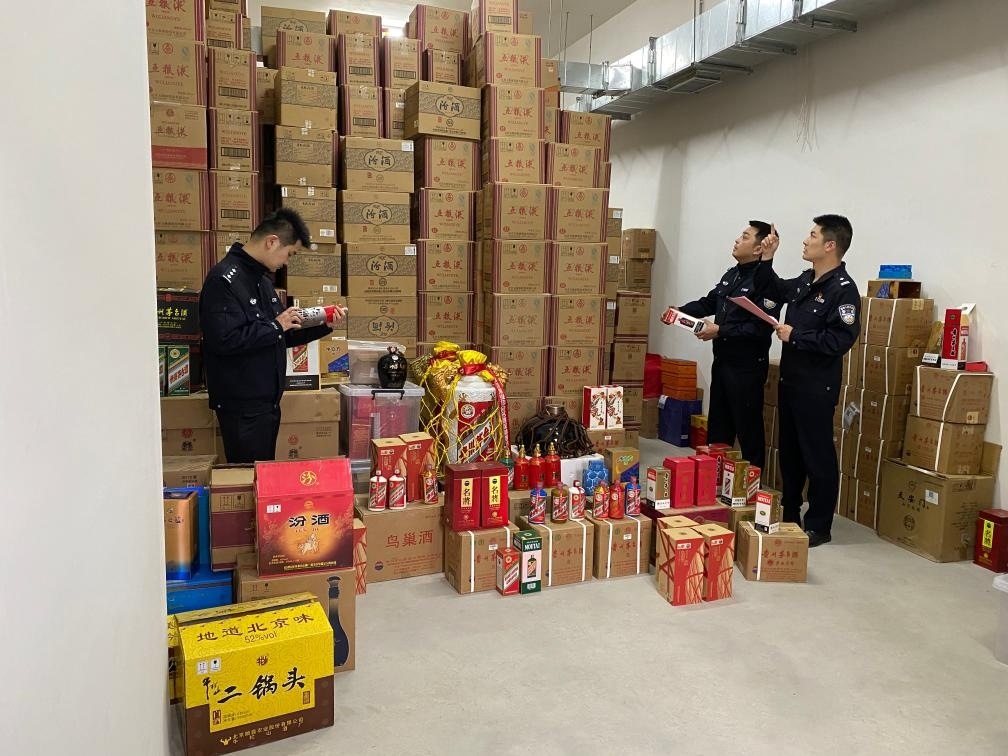 臺州市涉案財(cái)物管理中心一處庫房內(nèi),警方清點(diǎn)查獲的“特供”假酒。 新華社記者馬劍 攝
