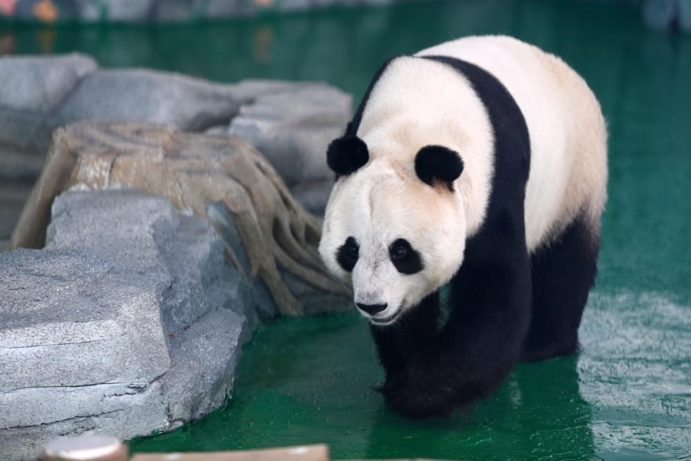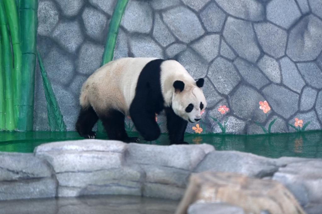 繼續(xù)前行進(jìn)入大熊貓2號館,便能看到園內(nèi)唯一的雌性大熊貓“曼蘭”。今年7歲的它“兩耳不聞窗外事”,疾步快走,不停地在館舍內(nèi)繞圈子。住在它隔壁的6歲雄性大熊貓“滿滿”則鏡頭感十足,當(dāng)游客拿出手機(jī)拍攝時(shí),它趴在地上吐舌頭“賣萌”,不一會(huì)又變換姿勢,攀上木樁玩耍,吸引眾多游客紛紛按下快門,記錄它活潑可愛的一面。