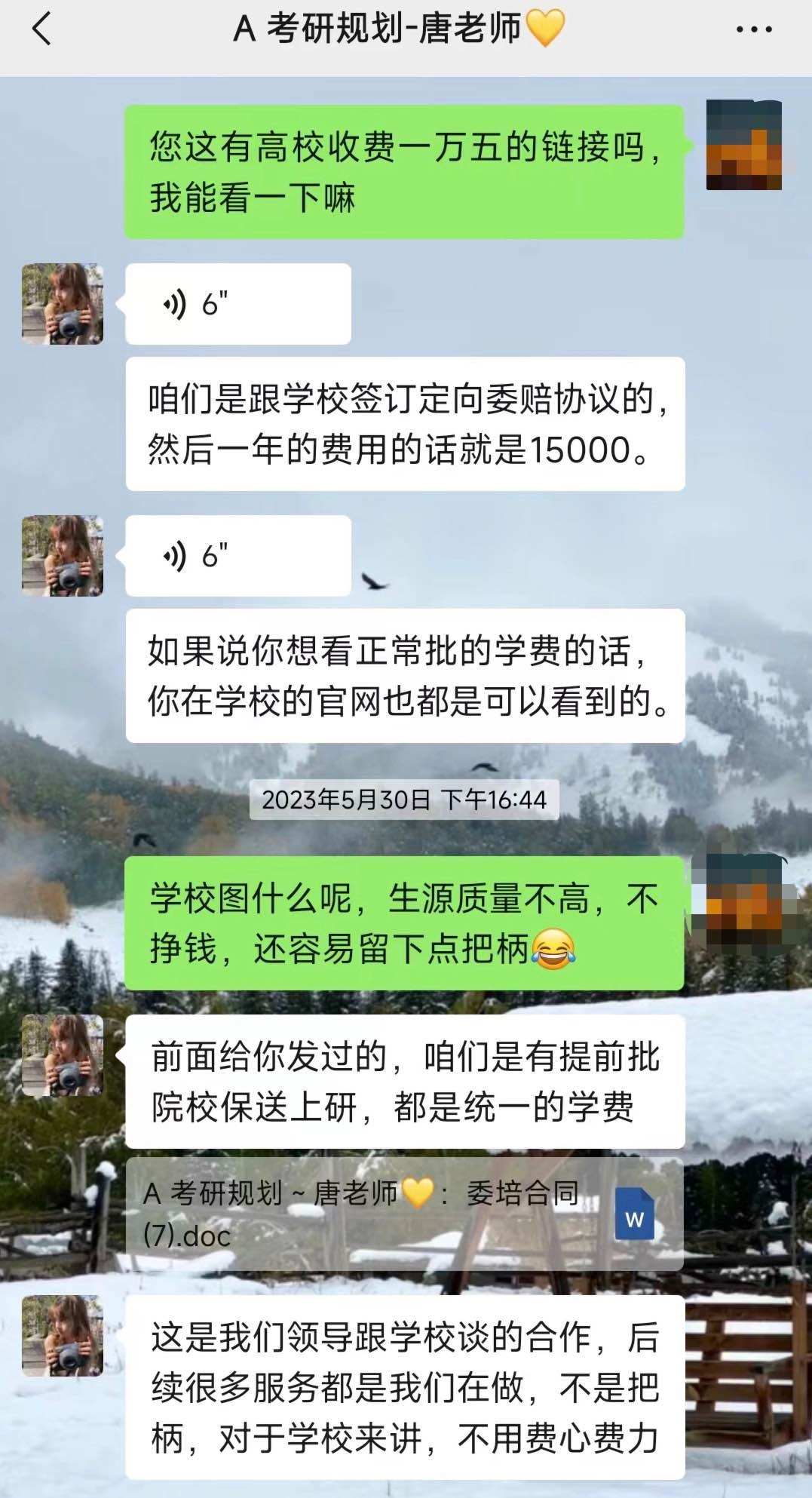 陳鑫說,對方得知他計劃報考中央財經(jīng)大學(xué)非全日制MBA后,還表示機構(gòu)可以提供學(xué)費優(yōu)惠,一般MBA的學(xué)費大概是20萬左右,但該機構(gòu)的招生老師說他們和中央財經(jīng)大學(xué)、對外經(jīng)貿(mào)大學(xué)、北京工商大學(xué)三所大學(xué)的非全日制工商管理專業(yè)都有渠道合作,不僅可以保證筆試、面試通過,還可以幫他走定向委培協(xié)議,這樣學(xué)費就只需要15000元一年。