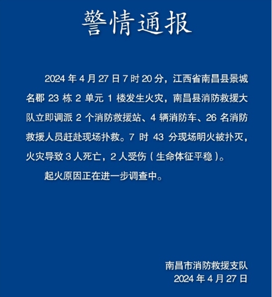 ·江西南昌一小區(qū)發(fā)生火災(zāi),造成3人死亡2人受傷。