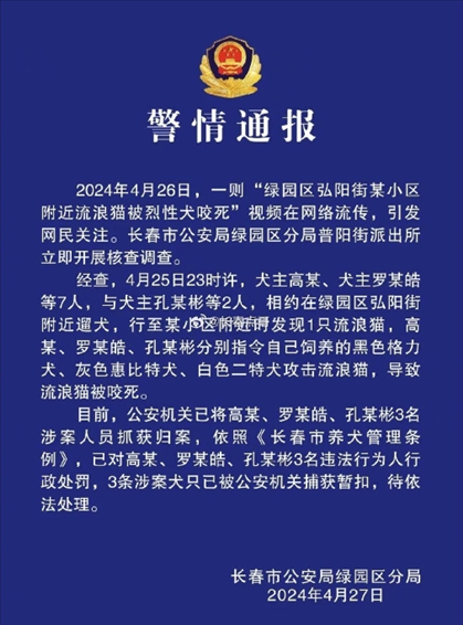 ·長(zhǎng)春警方通報(bào)3人指使烈性犬咬死流浪貓:已行政處罰。