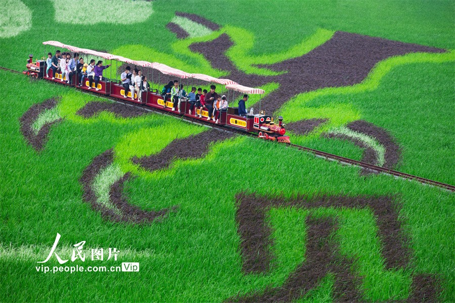 2024年5月2日,廣西南寧市賓陽縣古辣鎮(zhèn)大陸村綠油油的田野上,“見龍在田 國安家圓”大型中國龍主題稻田藝術(shù)畫吸引了許多游客前來參觀游覽。曾祥忠攝(人民圖片網(wǎng))
