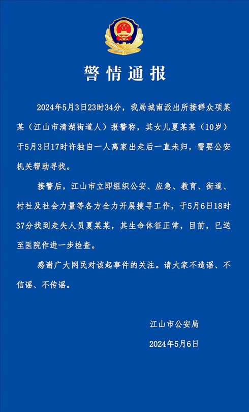 ·浙江衢州警方:走失3天10歲女孩已找到,生命體征正常。