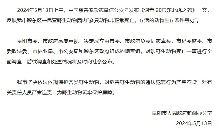 央視網(wǎng)消息:據(jù)“阜陽(yáng)發(fā)布”微信公眾號(hào)消息,阜陽(yáng)市人民政府新聞辦公室發(fā)布情況通報(bào),2024年5月13日上午,中國(guó)慈善家雜志微信公眾號(hào)發(fā)布《調(diào)查|20只東北虎之死》一文,反映阜陽(yáng)市潁東區(qū)一民營(yíng)野生動(dòng)物園內(nèi)“多只動(dòng)物非正常死亡,存活的動(dòng)物生存條件惡劣”。