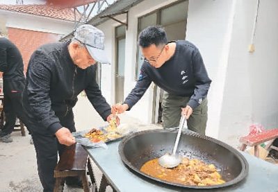 趙昊(右)在劉皮村“孝善大食堂”為鄉(xiāng)親打飯。健康時報記者 韓金序攝