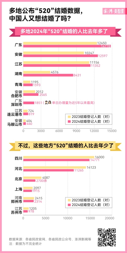 2023 年多地“520”領(lǐng)證人數(shù)下跌,引起熱議。2024 年的“520”剛剛過去,多地披露了當(dāng)日結(jié)婚登記數(shù)。廣東、安徽、江蘇等省當(dāng)日領(lǐng)證人數(shù)較去年有回升。澎湃新聞從深圳市民政局獲悉,截至 5 月 20 日 18 時 30 分,“520”全天共辦理結(jié)婚登記 1851 對,單日辦理量為近 5 年以來最高。中國人又重燃對婚姻的渴望了嗎?