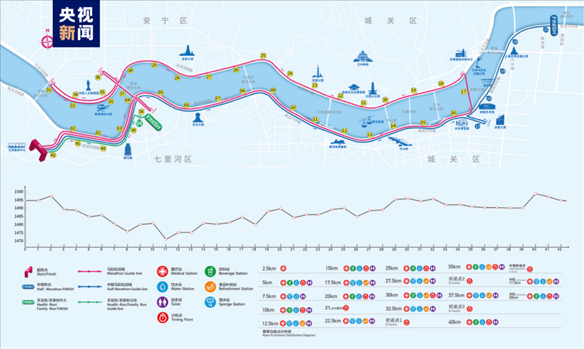 馬拉松所有項目起點為蘭州奧體中心,全程馬拉松終點與起點相同,半程馬拉松終點在南濱河東路(軌道二號線雁白大橋站附近),健康跑和家庭跑終點在馬灘北路十字。
