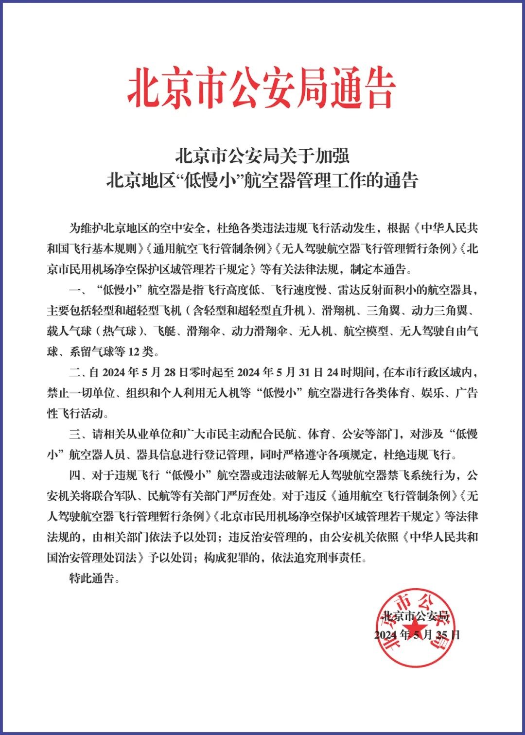 央視網(wǎng)消息:據(jù)“首都治安微提示”公眾號消息,5月25日,北京市公安局發(fā)布了《北京市公安局關(guān)于加強北京地區(qū)“低慢小”航空器管理工作的通告》,其中明確:自2024年5月28日零時起至2024年5月31日24時期間,在北京市行政區(qū)域內(nèi),禁止一切單位、組織和個人利用無人機等“低慢小”航空器進行各類體育、娛樂、廣告性飛行活動。