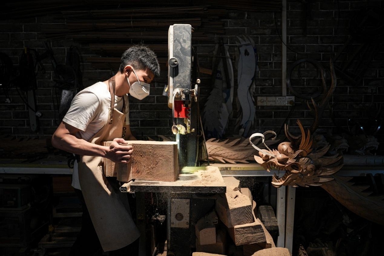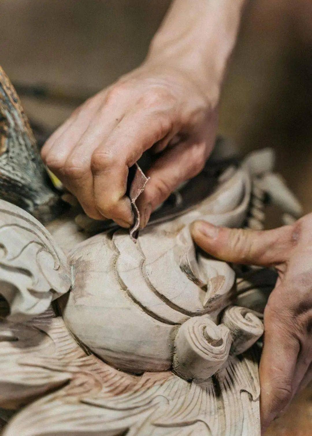 張偉潮身上的傷也沒斷過?!疤焯旄洞蚪坏?,有時候傷口剛縫了線,回到家一干活,刀口又開了”,手臂上、手背上遍布的傷疤,見證了每一個龍頭的誕生。“每下一刀,我都已經想好了后面的第二步、第三步”,龍頭雕刻極為考究,從選料、切割,到粗雕、精雕,再到打磨、拋光、裱漆,十幾道繁瑣工序,全靠師傅的眼光和手藝。機械化、流水線,做不出龍頭嗎?在數(shù)不清的日夜里,光影斑駁間,張偉潮拿著父輩傳下的一刀一錘,一下一下,慢慢開鑿,給出自己的答案。