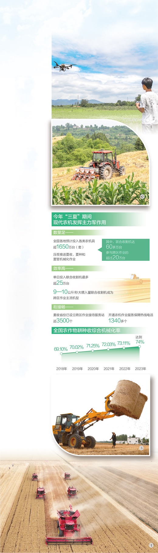 圖①:湖南省藍(lán)山縣塔峰鎮(zhèn)荷葉塘村,農(nóng)技人員操作植保無人機(jī)在田間進(jìn)行施肥作業(yè)。彭 華攝(人民視覺) 圖②:四川省蓬溪縣群利鎮(zhèn)五龍村,農(nóng)機(jī)手駕駛播種機(jī)開展大豆玉米復(fù)合播種。吳奉家攝(人民視覺) 圖③:山東省棗莊市嶧城區(qū)古邵鎮(zhèn)新村,農(nóng)機(jī)手實(shí)施小麥秸稈裝車運(yùn)輸作業(yè)。孫 慧攝(人民視覺) 圖④:河南省舞陽縣田間,聯(lián)合收割機(jī)高效開展麥?zhǔn)兆鳂I(yè)。姚 彬攝(人民視覺) 數(shù)據(jù)來源:農(nóng)業(yè)農(nóng)村部