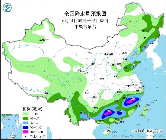 圖4 全國降水量預(yù)報(bào)圖(6月14日08時(shí)-15日08時(shí))