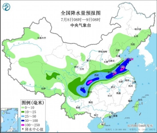 7月7日08時至8日08時,陜西中南部、黃淮大部等地部分地區(qū)有大到暴雨,其中,山東中東部和南部等地部分地區(qū)有大暴雨,山東南部等地局地特大暴雨(250~280毫米)。內(nèi)蒙古中部部分地區(qū)有4~5級風(fēng)。