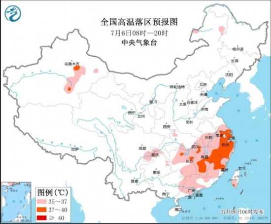 全國高溫落區(qū)預(yù)報(bào)圖(7月6日08時-20時) 圖源:中央氣象臺網(wǎng)站