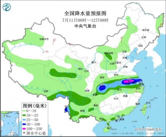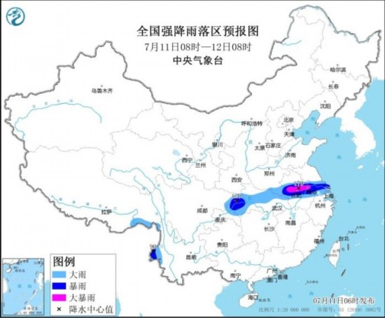 7月11日08時(shí)至12日08時(shí),四川東北部、重慶中北部、湖北西部和北部、河南東南部、安徽中部、江蘇南部、上海以及西藏東南部、云南西部等地部分地區(qū)有大到暴雨,其中,安徽中部、江蘇西南部、重慶北部等地部分地區(qū)有大暴雨(100~170毫米)。內(nèi)蒙古東南部和西北部、黑龍江東部、新疆東部、浙江中北部等地部分地區(qū)有4~6級(jí)風(fēng),其中,新疆東部部分地區(qū)有6~7級(jí)風(fēng)。