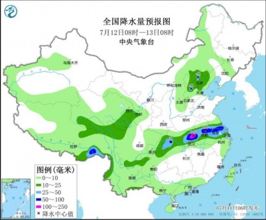 全國(guó)降水量預(yù)報(bào)圖(7月12日08時(shí)-13日08時(shí))