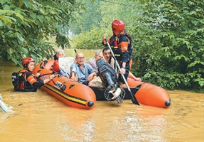 在河南省南陽市社旗縣李店鎮(zhèn),消防救援人員把受災村民轉(zhuǎn)移到安全的地方。高 嵩攝(人民圖片)