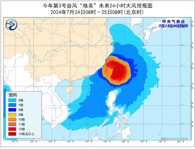 大風(fēng)預(yù)報:7月24日08時至25日08時,黃海西南部、東海大部及釣魚島附近海域、臺灣海峽、臺灣以東洋面、巴士海峽、南海大部、臺灣島沿海、浙江沿海、福建沿海、江蘇東南部沿海、上海沿海、長江口區(qū)、杭州灣將有7-9級大風(fēng),其中東海南部及釣魚島附近海域、臺灣以東洋面、臺灣島東部和北部沿海、福建中北部沿海的風(fēng)力有10-12級,“格美”中心經(jīng)過的附近海面或地區(qū)的風(fēng)力有13-16級,陣風(fēng)17級以上。