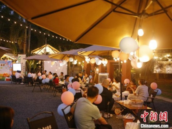 活動現(xiàn)場,搭建了露營帳篷、休閑桌椅一字排開,布置了彩色氣球,提供甜品、水果、飲料等,燈光閃爍、晚風習習,氛圍甜蜜而浪漫。
