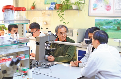 中國科學(xué)院院士宋微波(中)在指導(dǎo)學(xué)生開展科研。