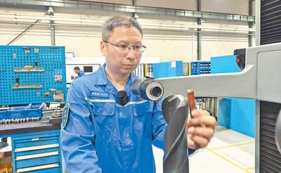 “是這里!”經(jīng)過檢查,陳國靖發(fā)現(xiàn),設(shè)備磨損導(dǎo)致扭力值不能滿足需求。他隨即從工具柜中取出備件,20秒便更換完畢,讓停滯的設(shè)備重新運轉(zhuǎn)。
