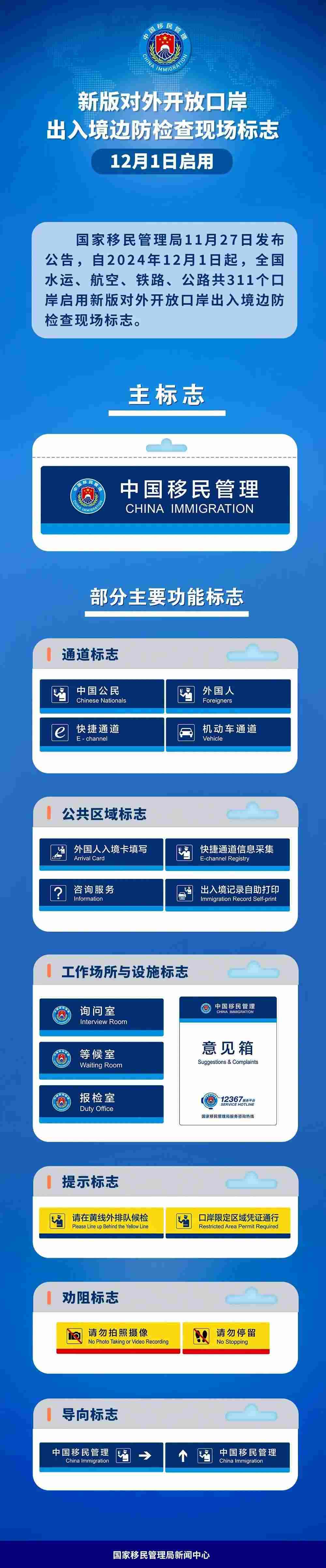 人民網(wǎng)北京11月27日電 (記者梁秋坪、郝萍)國(guó)家移民管理局11月27日發(fā)布公告,自2024年12月1 日起,全國(guó)水運(yùn)、航空、鐵路、公路共311個(gè)口岸啟用新版對(duì)外開放口岸出入境邊防檢查現(xiàn)場(chǎng)標(biāo)志。