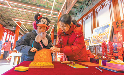 除夕,游客在慶成宮后殿的文創(chuàng)空間里拓印“?!弊?。