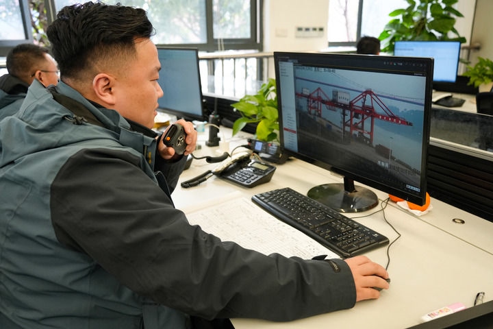 1月29日,調度員耿杰在重慶果園港集裝箱公司生產(chǎn)調度指揮中心內值班。新華社記者 田金文 攝