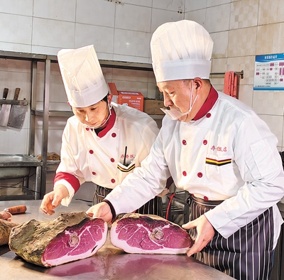 宣威市存香飯店,大廚徐天勇正忙著挑選食材,而烏金豬是制作宣威火腿的最佳原料?!半缰七^程也很重要,鹽的比例要恰到好處,多一分則咸,少一分則不夠味,經(jīng)過兩三年發(fā)酵,火腿就可以達到生吃的標準了?!毙焯煊掠霉轻樰p輕插入火腿的上、中、下部,火腿肉質(zhì)清香撲鼻,“就是它了。”