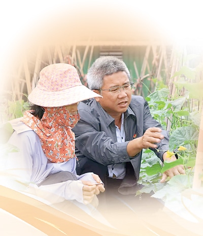 海南三亞市育才生態(tài)區(qū)那受村,駐村第一書記肖春雷(右)指導農戶種植黃瓜。