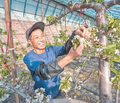 新疆生產(chǎn)建設(shè)兵團(tuán)第十師一八八團(tuán)海川鎮(zhèn)櫻桃大棚內(nèi),種植戶正在管護(hù)櫻桃樹(shù)。