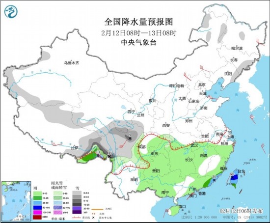 2月12日08時(shí)至13日08時(shí),內(nèi)蒙古東北部、吉林東部、遼寧東部、新疆南疆西部山區(qū)、西藏東部、青海南部、川西高原、云南西北部、貴州西部等地的部分地區(qū)有小到中雪或雨夾雪,其中,西藏東部局地有大到暴雪(10~12毫米)。西藏東南部、福建南部、廣東東部、臺(tái)灣島等地的部分地區(qū)有中到大雨,其中,臺(tái)灣島中部局地有暴雨(50~60毫米)。內(nèi)蒙古中東部、河北北部、山東半島、西藏南部、川西高原等地的部分地區(qū)有4~5級(jí)風(fēng);黃海、東海、臺(tái)灣海峽、南海北部海域等海域有6~7級(jí)風(fēng)。