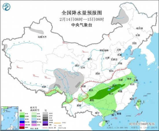 2月14日08時(shí)至15日08時(shí),內(nèi)蒙古東北部、新疆沿天山地區(qū)、西藏東部、川西高原、云南北部等地的部分地區(qū)有小雪或雨夾雪,其中,西藏東部、川西高原東部等地部分地區(qū)有中雪。貴州、重慶南部、湖北南部、湖南、江西北部、安徽南部、浙江北部、江蘇南部、廣西東部和北部、廣東中西部、海南島東部、臺(tái)灣島等地的部分地區(qū)有小到中雨,其中,湖北南部、湖南北部等地局地有大雨(25~30毫米)。內(nèi)蒙古中西部、西藏北部和西部、甘肅河西等地部分地區(qū)有4~6級(jí)風(fēng);臺(tái)灣海峽、巴士海峽、南海北部等海域有6~7級(jí)風(fēng)。