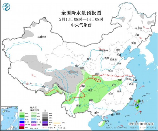 2月13日08時(shí)至14日08時(shí),新疆伊犁河谷和南疆盆地南部、西藏東部和北部、青海南部、甘肅西南部、川西高原、云南西北部等地部分地區(qū)有小到中雪或雨夾雪,其中,西藏東南部局地有大雪(5~8毫米)。西藏東南部、四川盆地東部、貴州、云南東部、湖南北部、湖北中南部、江西北部、安徽南部、海南島東部、臺(tái)灣島等地部分地區(qū)有小到中雨,其中,臺(tái)灣島中部局地有大雨(25~45毫米)。內(nèi)蒙古中部、黑龍江東部、吉林東部、西藏中西部等地部分地區(qū)有4~6級(jí)風(fēng);東海、臺(tái)灣海峽、巴士海峽、南海北部等海域有6~7級(jí)風(fēng)。