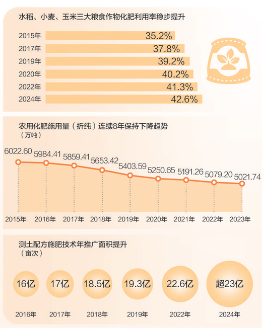 2024年,我國水稻、小麥、玉米三大糧食作物化肥利用率為42.6%,比2022年提高1.3個(gè)百分點(diǎn)?;世寐?,即化肥被作物吸收利用的比例,反映了化肥在農(nóng)業(yè)生產(chǎn)中的有效利用程度??茖W(xué)施肥效果提升,折射農(nóng)業(yè)發(fā)展方式之變。