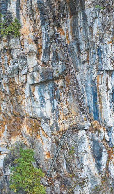 第三條路被村民們稱作“天路”。這是一段垂直高度200米的懸崖峭壁,大約1小時就能抵達山頂,但全程需要沿峭壁攀爬?!芭赖臅r候根本不敢往下看,只有初中的大孩子偶爾會在家長帶領(lǐng)下走這條路?!卞X慶輝說。