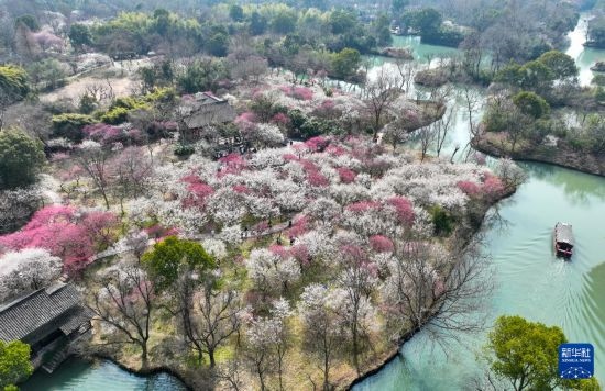 2月26日,游船經(jīng)過(guò)杭州西溪濕地一片盛開的梅林(無(wú)人機(jī)照片)。