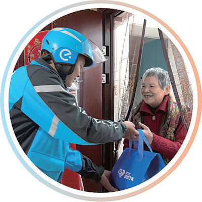 外賣騎手張魁在社區(qū)開展助老送餐服務(wù)。